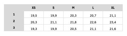 Um die richtige Größe für dich zu wählen, empfehlen wir einen direkten Vergleich mit einem gutsitzenden Teil von dir und den tabellarisch aufgelisteten Größenangaben.